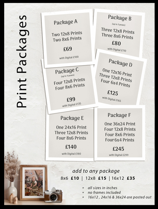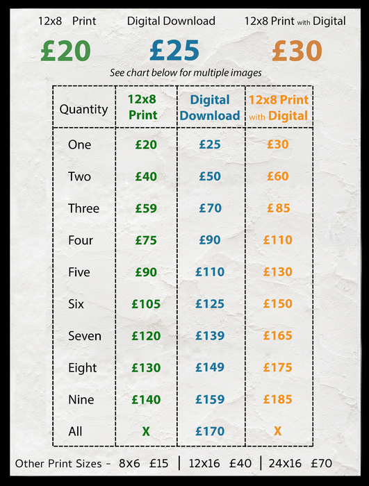 Important Note: Once ordered and printed, all packages must be paid for in full: reductions/changes to your order can only be made prior to printing.Please ensure you are happy with your photographs prior to downloading; No refunds will be given on digital files. For best download results please download to a computer, mobile phones can sometimes compress the image and make the image size smaller